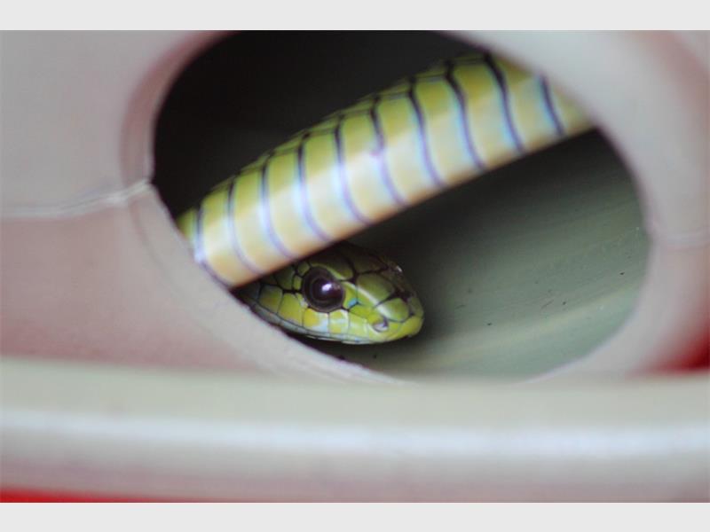 Two years in lockdown included a male boomslang in the laundry that was not happy hiding in a watering can.